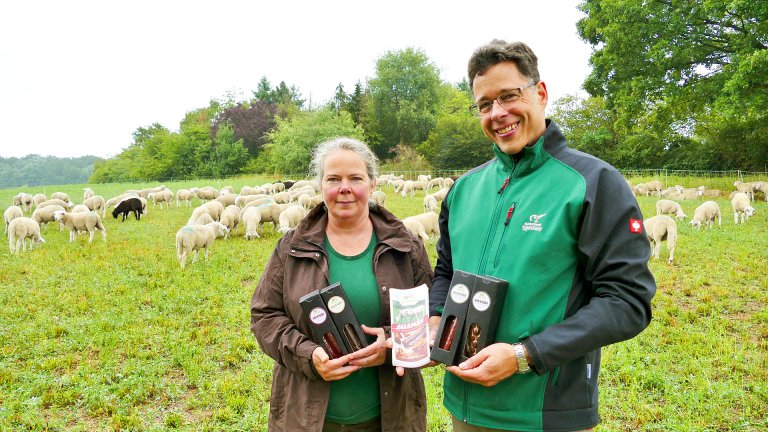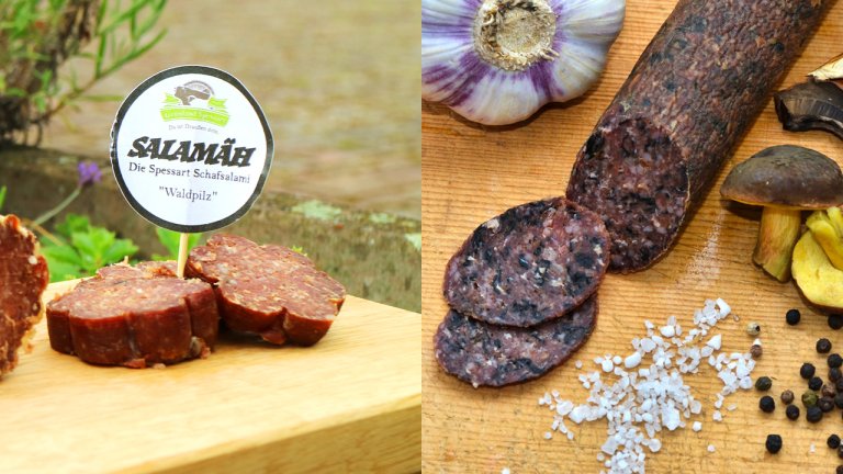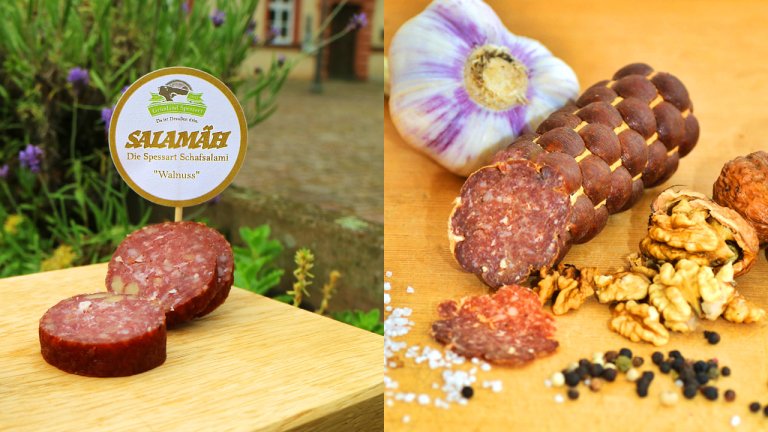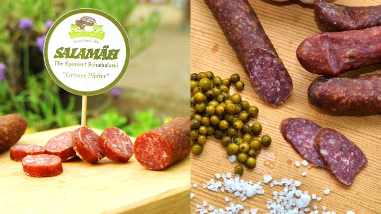 Die Schafsalami SALAMÄH gibt es in vier leckeren Geschmacksrichtungen! Das Schaf- und Lammfleisch stammt von regionalen Schäfereien aus dem Naturpark Spessart, die gemäß dem Markenprogramm von Grünland Spessart zertifiziert sind. Ihre Schafe grasen tiergerecht auf regionalen Weiden. Diese Kombination garantiert eine hohe Fleischqualität, kurze Transportwege und eine handwerkliche Verarbeitung.