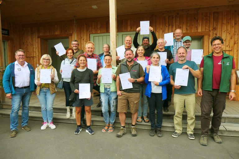 Mit dem vierten Kurswochenende bei der Bike Lodge Spessart in Lohr-Steinbach fand der aktuelle Ausbildungsgang für zertifizierte Natur- und Landschaftsführerinnen und -führer (ZNL) seinen erfolgreichen Abschluss. 16 Teilnehmende legten am 20. September nach einer intensiven Vorbereitungsphase ihre praktische Prüfung ab und erhielten anschließend ihr Zertifikat. Eine weitere Teilnehmerin wird ihre Prüfung bei Gelegenheit nachholen.