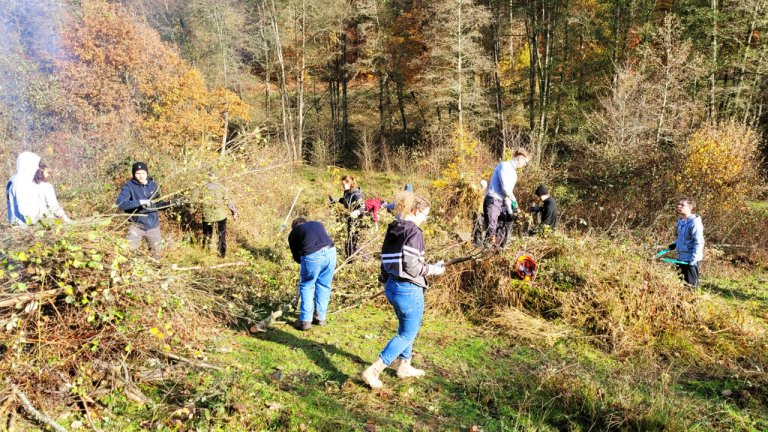 Von den Gebietsbetreuern Christian Salomon und Sabrina Jochum erfuhren die Schülerinnen und Schüler auch, warum es notwendig ist, die natürliche Sukzession aufzuhalten. Ohne gelegentliche Weidenachpflege würden Brombeeren und junge Bäume die offenen Flächen nach und nach überwachsen. Damit gingen wertvolle Lebensräume verloren, die auf Licht, Wärme und ein vielfältiges Blütenangebot angewiesen sind. Die Klassen arbeiteten daher aktiv mit, Gebüsche und Jungbäume zu entfernen – eine Aufgabe, die zeigt, dass Naturschutz nicht nur aus Schutz, sondern auch ausgestaltender Pflege besteht.