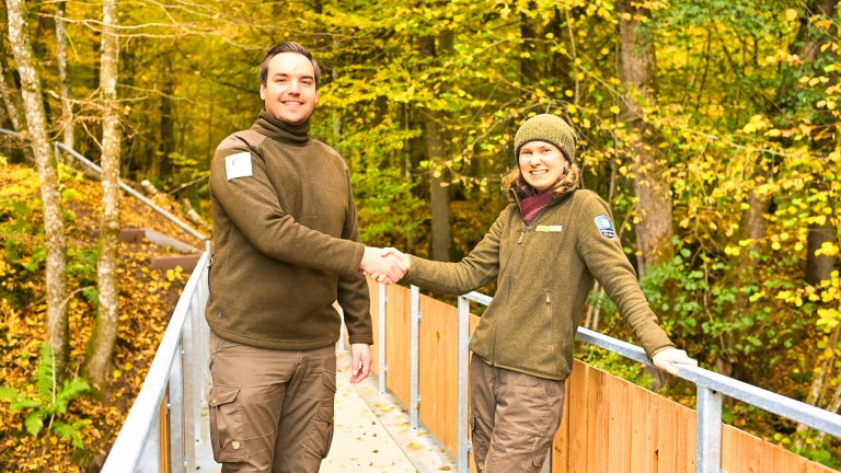Shakehands der beiden Ranger vom Naturpark Spessart (Felix Kühne, links im Bild) und Naturpark Bay. Rhön (Amelie Nöth, rechts im Bild) (Foto: Jennifer Weidle)