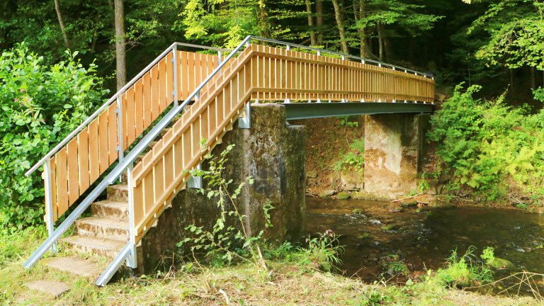 Aus dieser Haltung entstand nun ein Brückenprojekt mit Symbolkraft. Die alte Holzbrücke, über Jahrzehnte ein wichtiger Übergang im Naturschutzgebiet Schondratal, war stark beschädigt und musste ersetzt werden. Nun steht an gleicher Stelle ein stabiler Neubau; entworfen und gebaut von der Firma Albrecht Kleinhenz aus Gräfendorf: Eine verzinkte Stahlkonstruktion trägt hölzerne Geländer aus Douglasie, der Belag besteht aus trittsicherem Gitterrost, und eine Rampe erleichtert das Schieben von Fahrrädern.